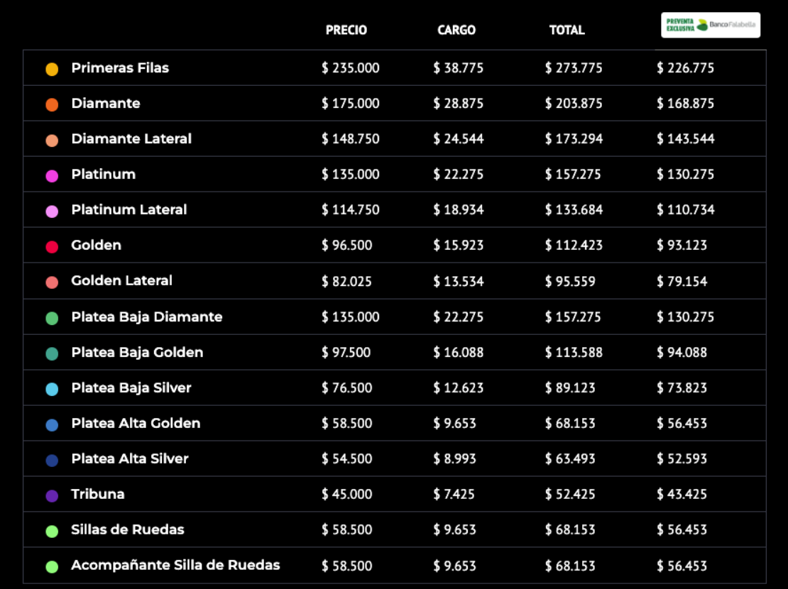 - * Preventa Banco Falabella (Stock 2.260 por fecha), máximo de compra 4 tickets por persona.